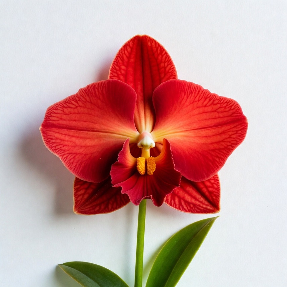 A bright red flower with a yellow center shows its vibrant petals against a white background. The green leaves support the flower's stem.