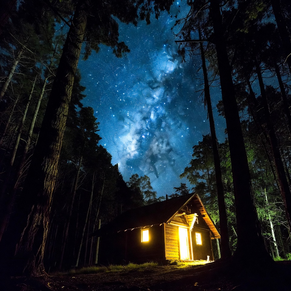 A cabin with warm light shines in the woods under a clear night sky filled with stars and the Milky Way. Tall trees surround the area.