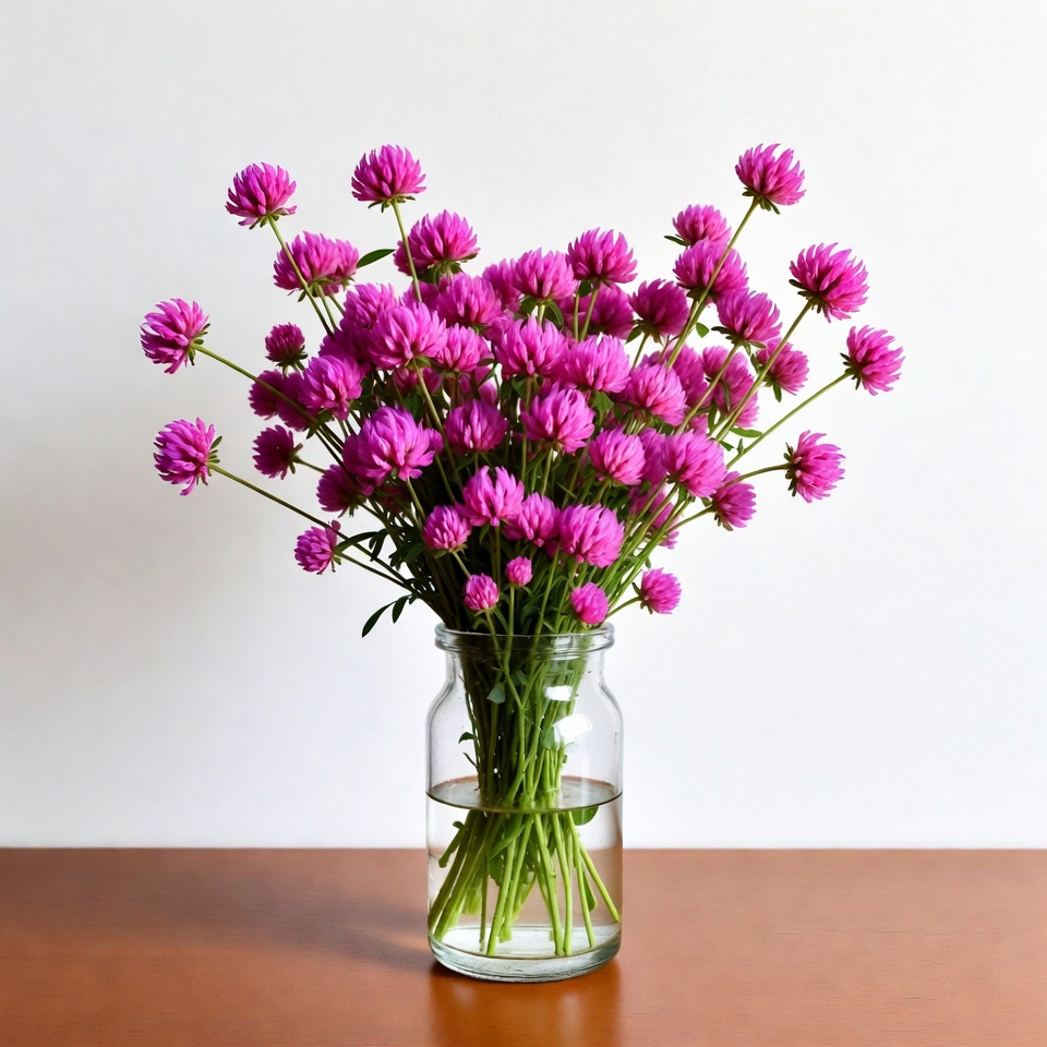 A clear glass vase holds a bunch of purple flowers on a table in a simple setting.