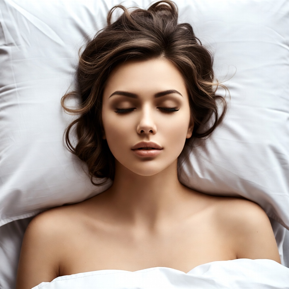 A woman is lying on her back in bed, eyes closed, with smooth sheets around her. She appears to be resting or sleeping quietly.