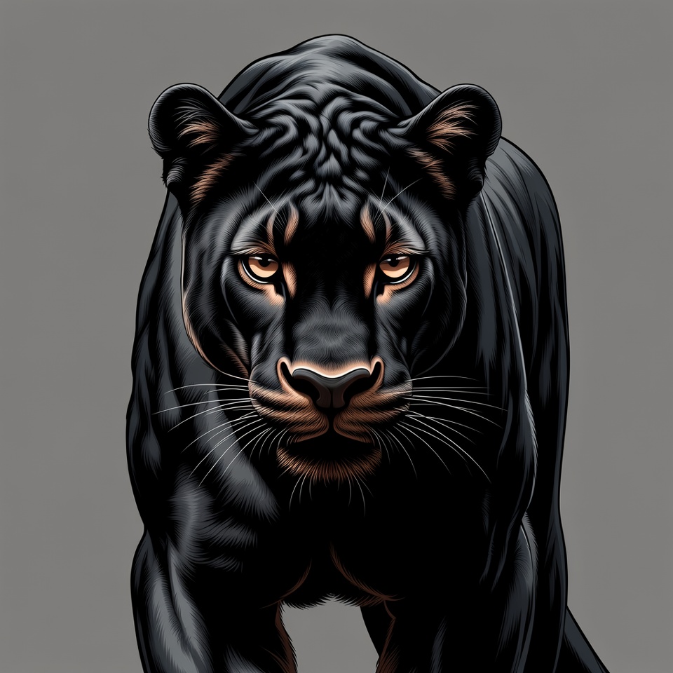 A black panther moves forward, eyes focused, showcasing its strong build and sleek fur against a gray backdrop.
