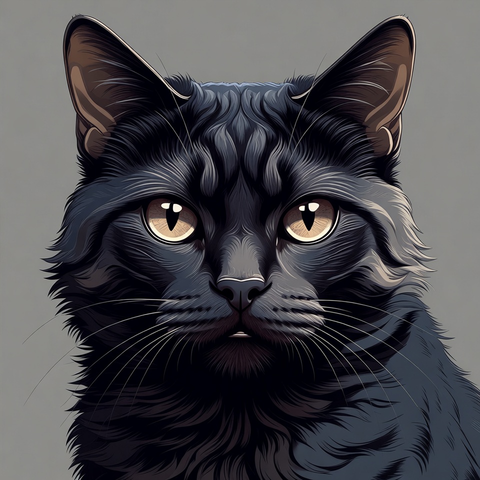 animal, animal art, black cat, cat lover, close-up, domestic, eyes, feline, fur, grooming, home, illustration, nature, pet, pet care, portrait, serious expression, tabby, unique features, whiskers