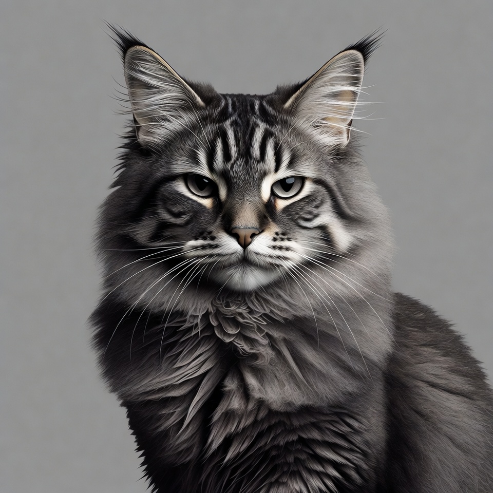 Maine Coon cat poses for a close-up shot against a gray background. Its fur is long and thick, showcasing its unique features clearly.