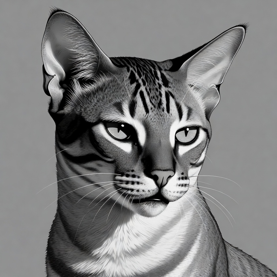 A cat poses for a close-up picture, showing its unique fur pattern and intense gaze in black and white. The background is simple and gray.