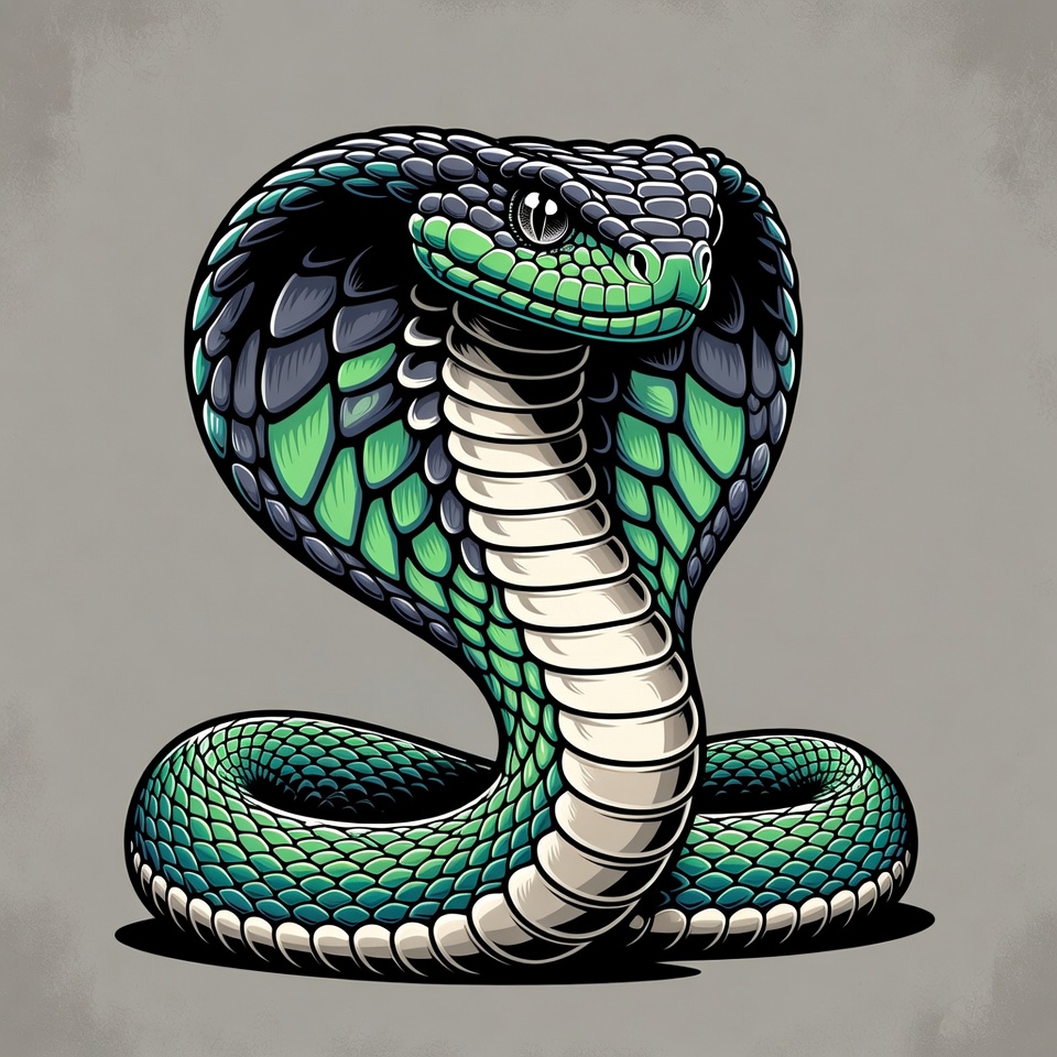 animal, art, black, coiled, creature, design, detailed, eyes, fantasy, graphic, green, illustration, nature, pattern, reptile, scales, snake, upright, venomous, wildlife