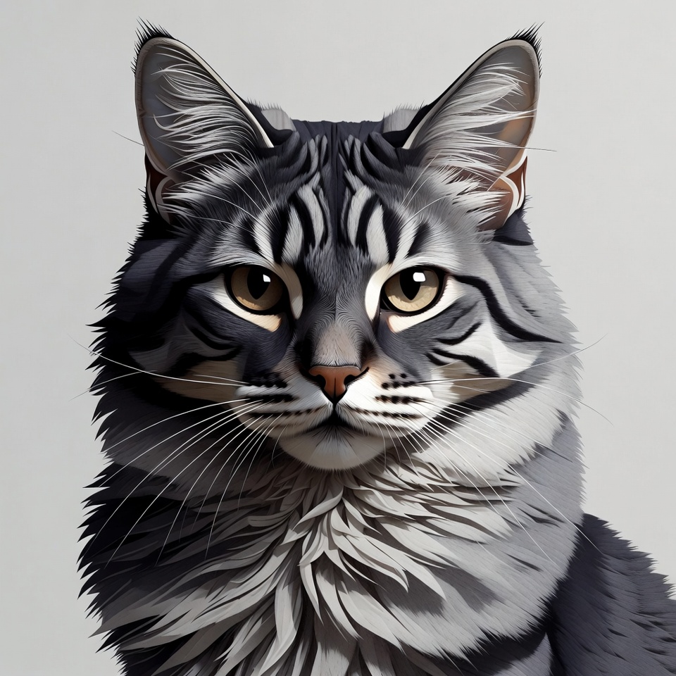 animal, art, black, cat, close-up, detailed, domestic, expression, eyes, face, features, fur, gray, illustration, nature, pet, portrait, sharp, tabby, whiskers