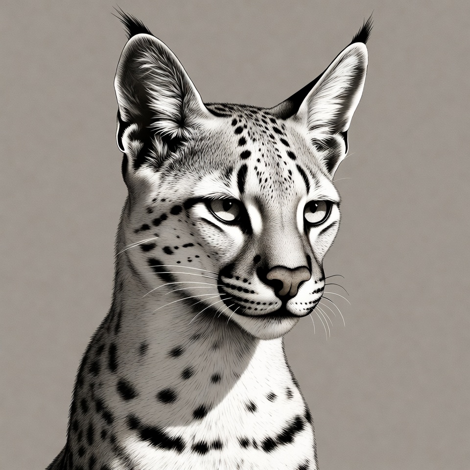 Africa, animal, animal behavior, art, big cat, design, drawing, ears, expressive eyes, feline, habitat, illustration, nature, portrait, predator, serval, sharp features, spotted fur, wild, wildlife