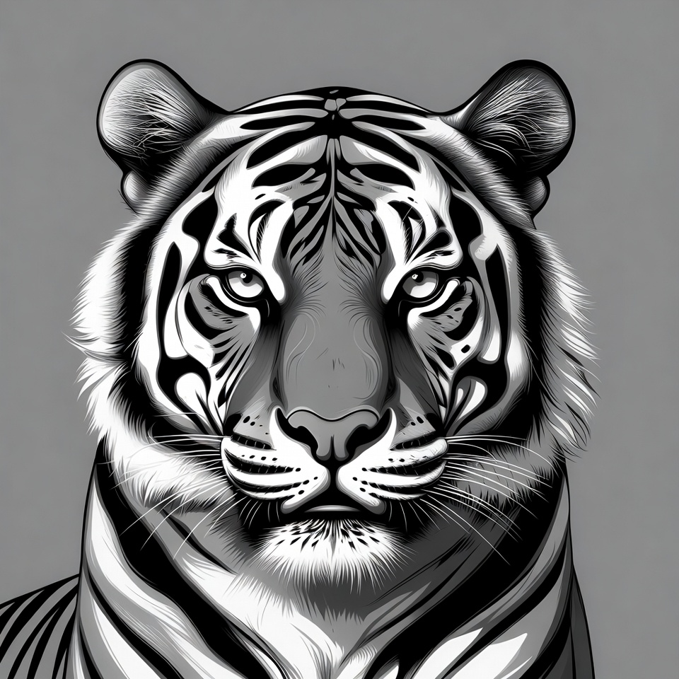 A detailed illustration of a tiger's face. The design features bold black lines and white areas, showing the tiger's expressive gaze.