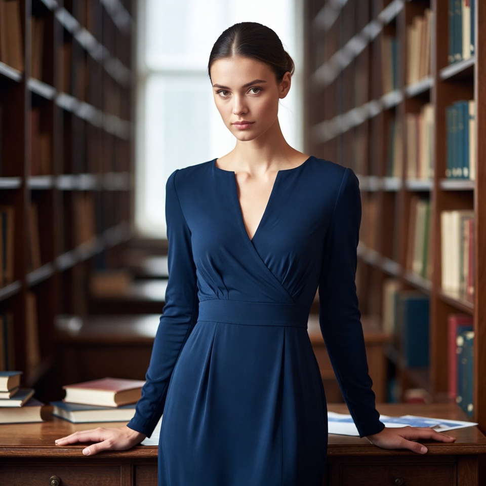 academic, books, brunette, concentration, dress, education, focus, gaze, interior, knowledge, library, literature, reading, shelves, silence, space, standing, study, table, woman