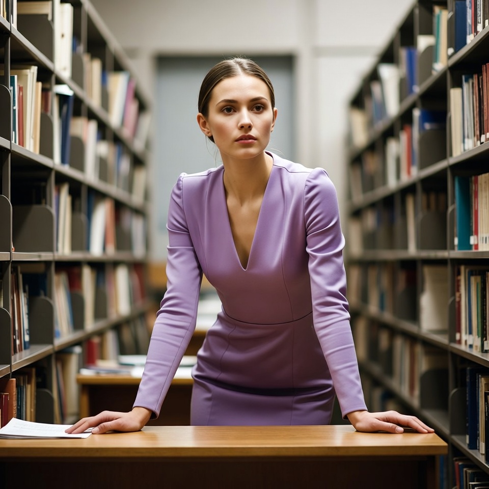 A woman stands in a library between shelves. She leans on a wooden table, looking thoughtful. Books surround her on both sides.