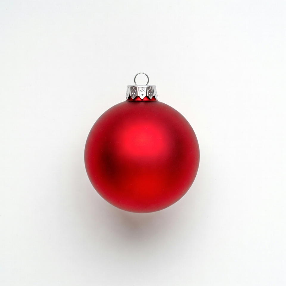 A round red ornament hangs against a plain white background. It is shiny and reflective, typical for holiday decorations.