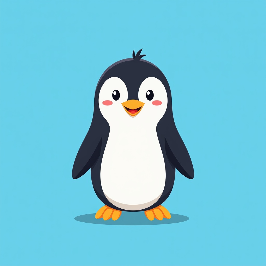 A penguin stands on a blue background, smiling with bright eyes and a cheerful expression. It has orange feet and a fluffy tuft on its head.