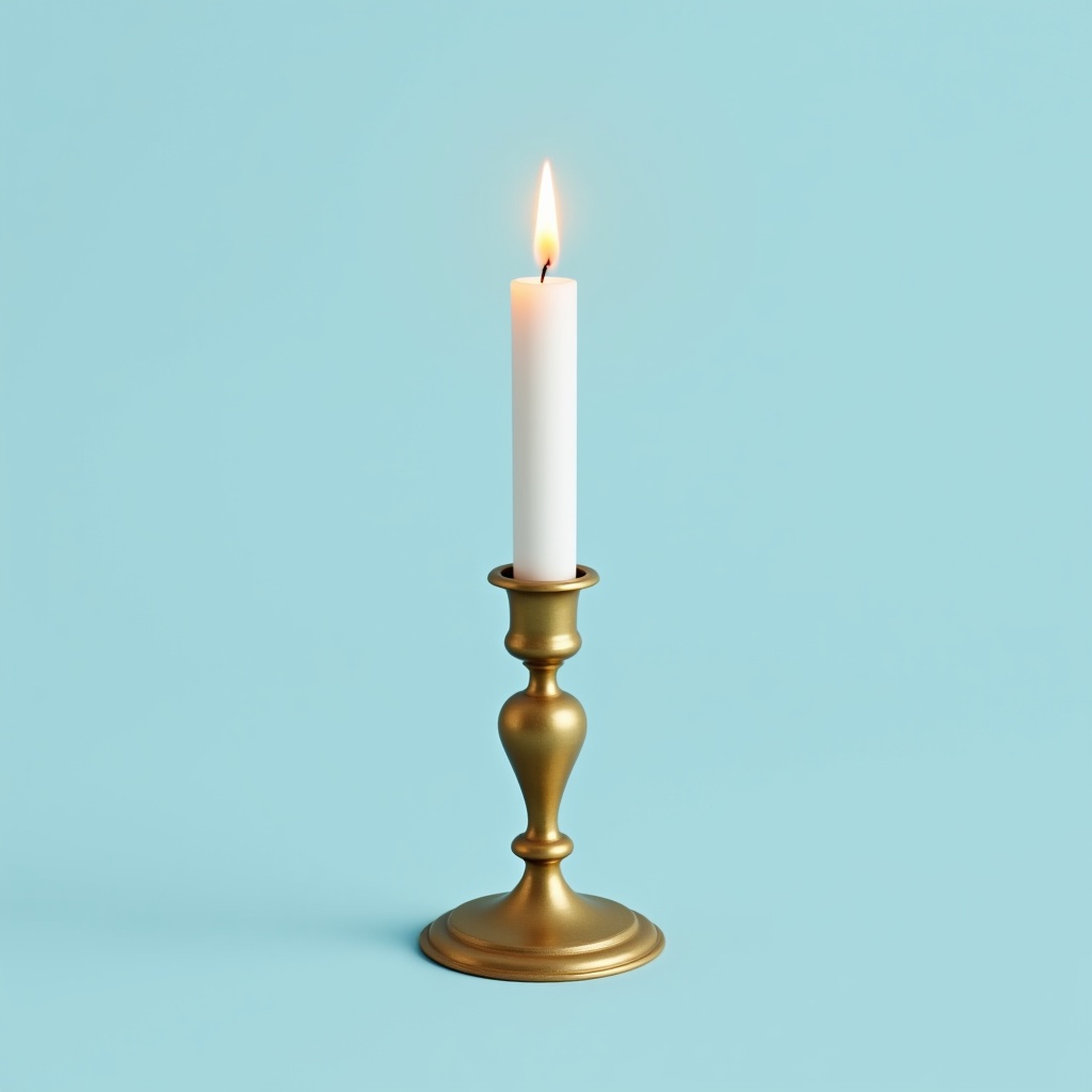 A white candle stands upright in a brass holder against a light blue backdrop. The candle is lit and creates a soft glow.