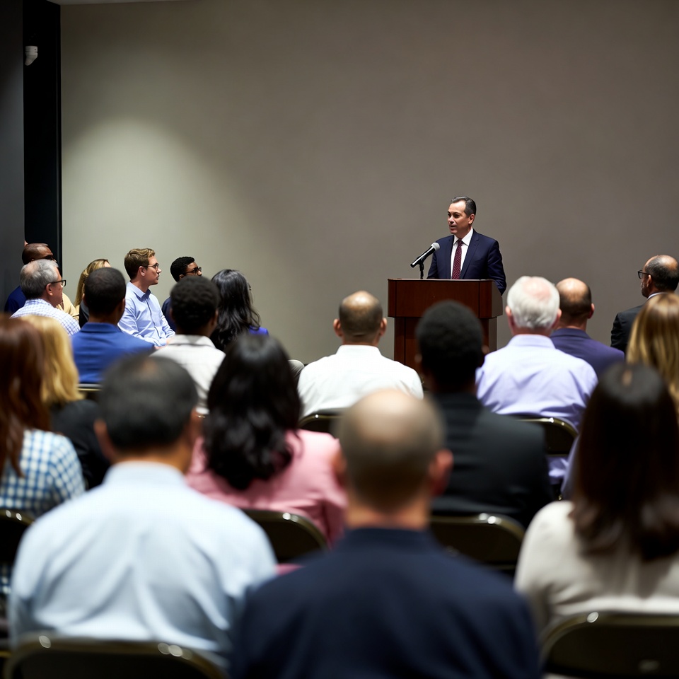 A person speaks at a podium in front of an audience during a formal gathering. Attendees listen attentively in a conference room.