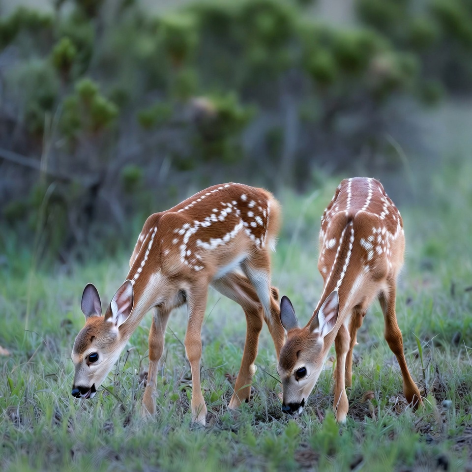 Two young fawns are feeding on grass in a grassy area surrounded by shrubs. It is early morning with soft light.