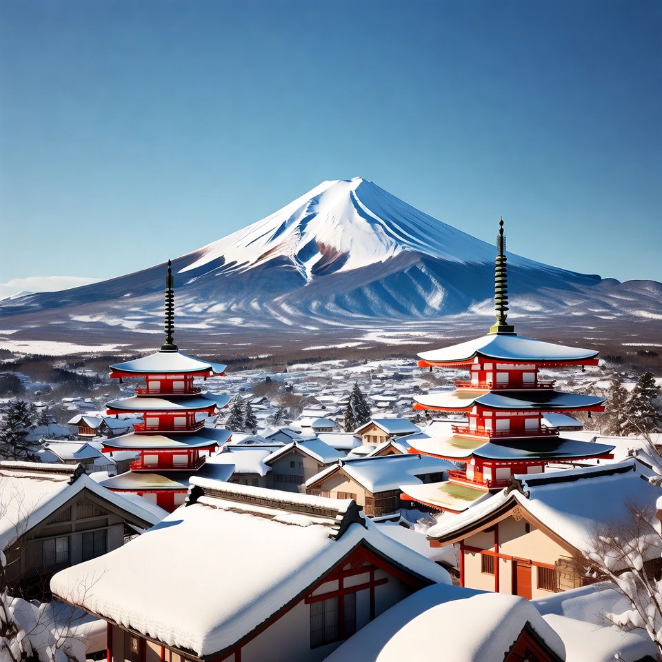 Mount Fuji stands tall above a village blanketed in snow. Two pagodas are visible in the foreground with roofs covered in white.