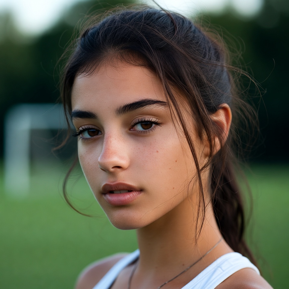 A young athlete stands in front of a soccer goal at dusk, looking straight ahead with focused eyes and a smooth expression.