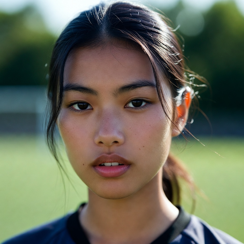 A young athlete stands on a soccer field focusing on the game. She appears ready for action and shows determination.