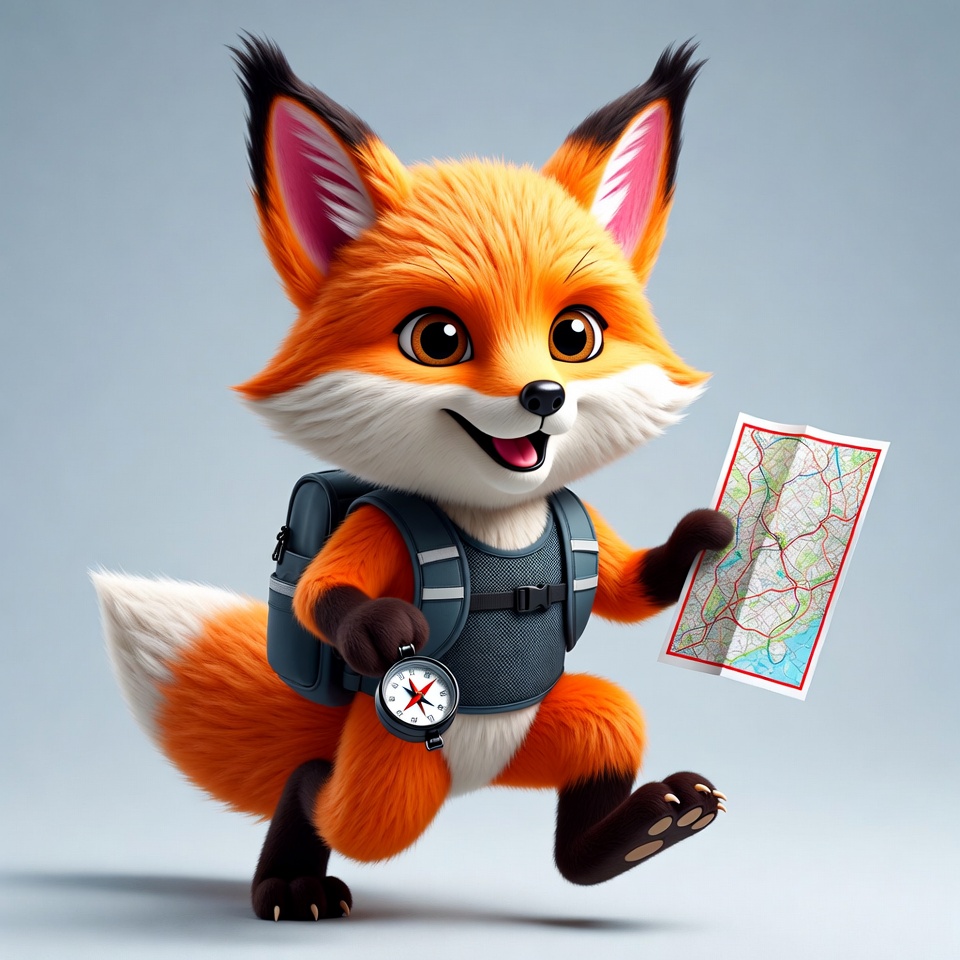 A cartoon fox holds a map and compass while smiling. It appears ready for an adventure outdoors, eager to explore new places.