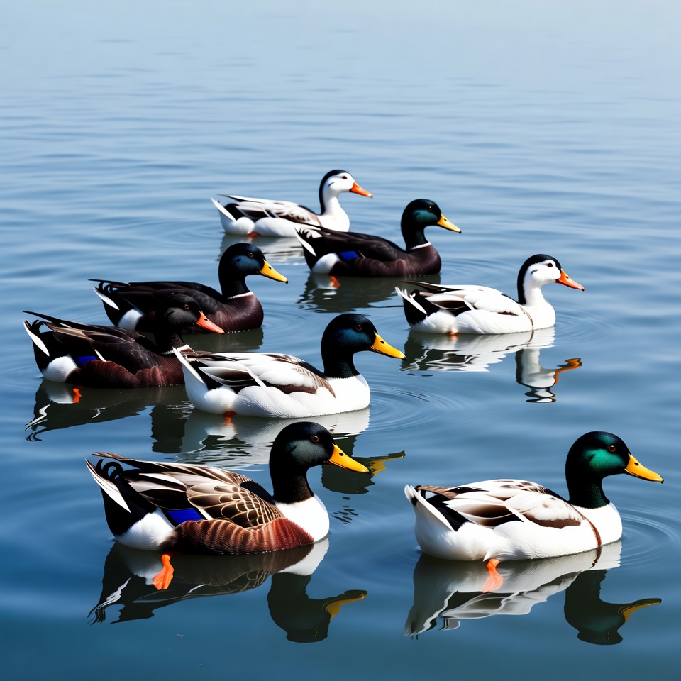 Several ducks swim together in clear water during the afternoon. Their reflections can be seen on the surface.