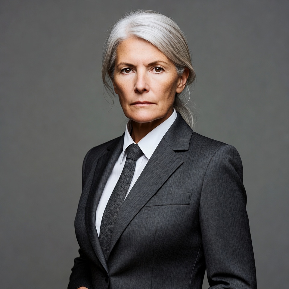 A senior woman with silver hair stands confidently in a suit. She poses against a gray background, showing a serious expression.