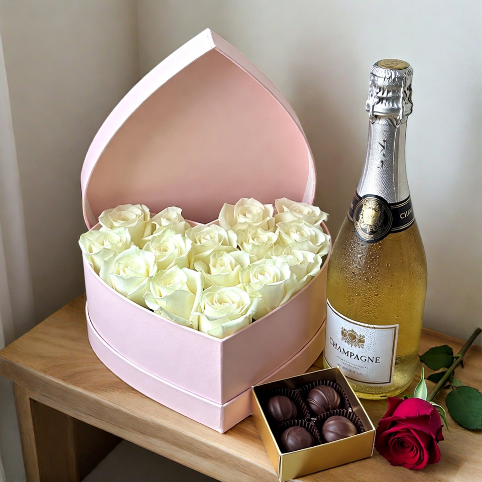 A heart-shaped box holds white roses beside champagne and chocolate. This setup is perfect for a special occasion.
