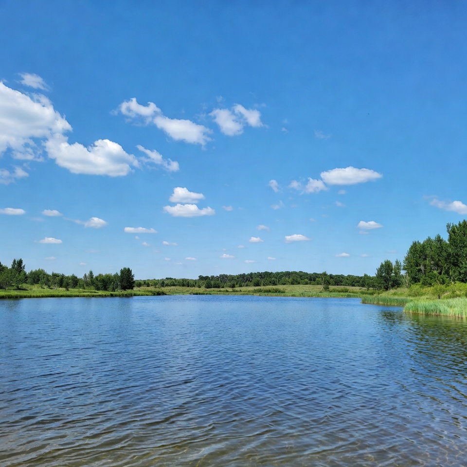 Clear blue sky over a river surrounded by trees. Gentle water reflects the clouds. Location is a peaceful natural area on a warm day.