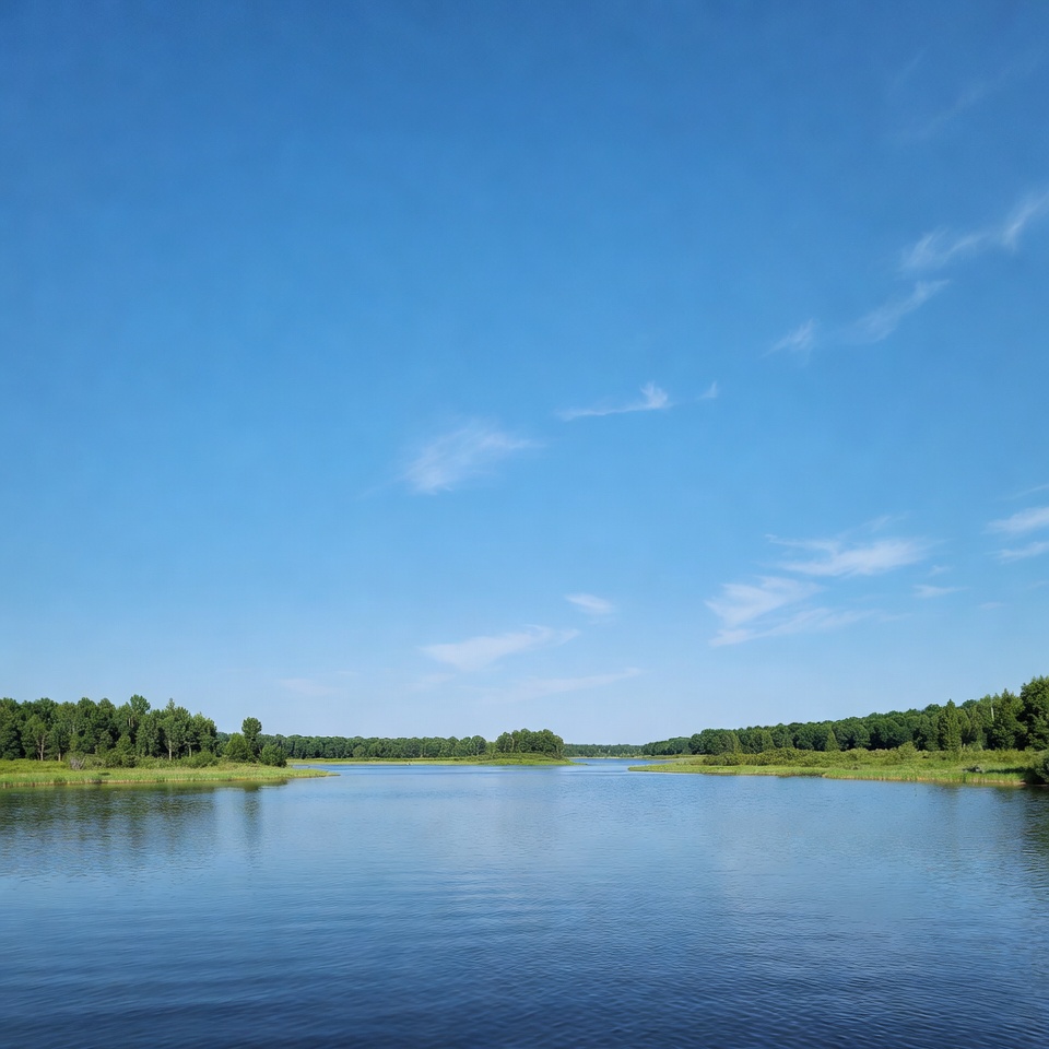 A wide body of water reflects a bright blue sky. Lush green trees line the shore under warm sunlight.