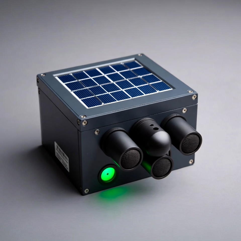 A small solar device with a solar panel on top and three black speakers in front is set against a gray background.