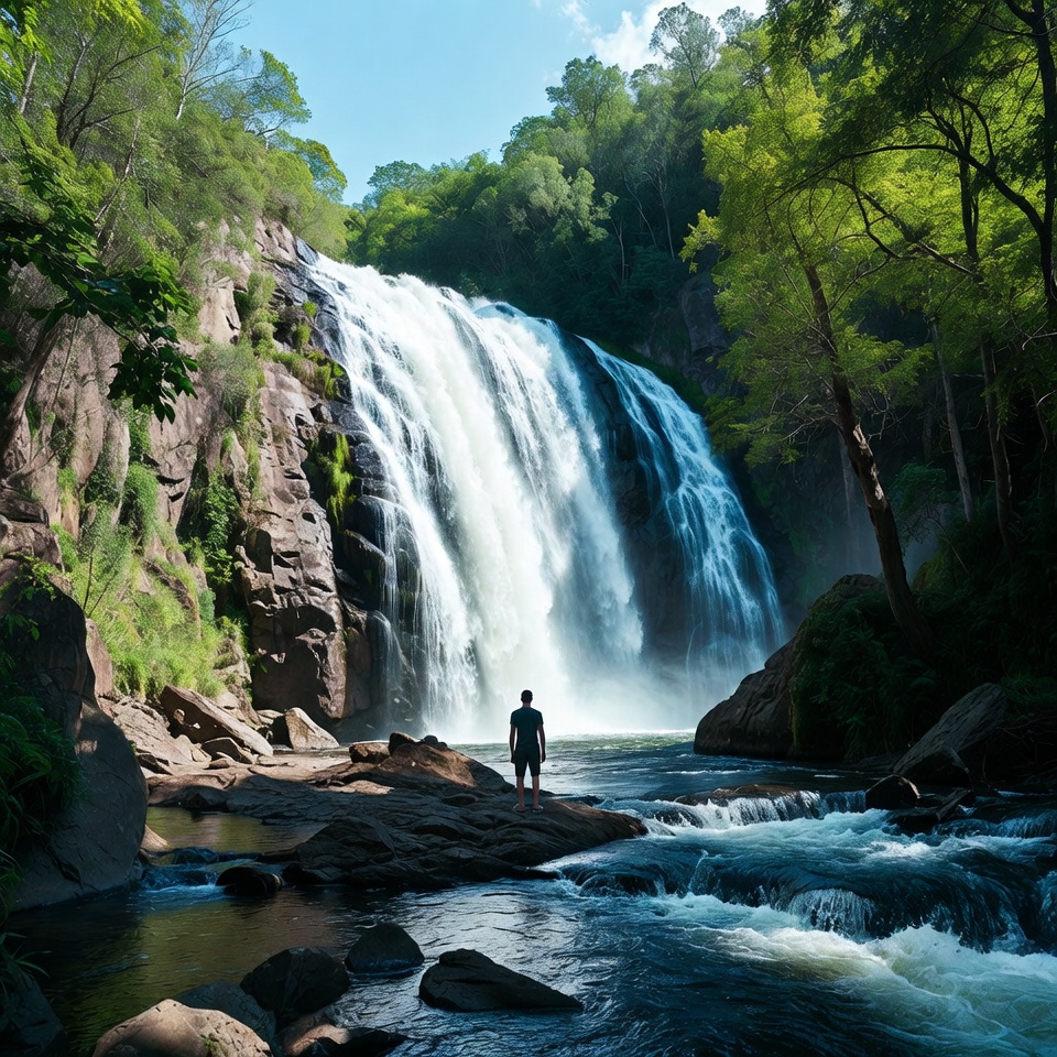 A person stands near a waterfall surrounded by trees. Water splashes down into a river below, creating a vibrant scene on a sunny day.