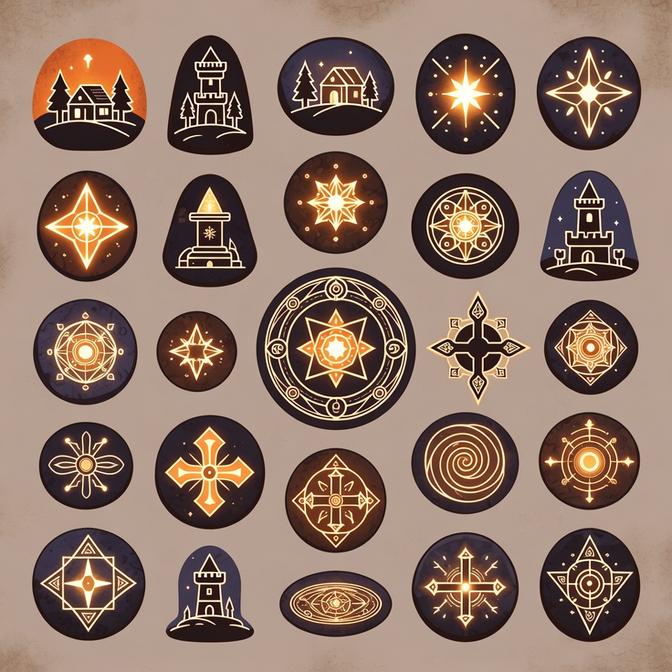 Various symbols show buildings, lights, and designs on a textured background. The shapes are round and star-like in appearance.