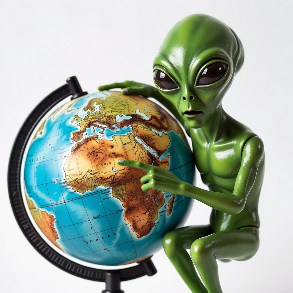 alien, countries, culture, display, earth, education, exploration, extraterrestrial, figure, geography, globe, green, learning, model, oceans, pointing, science, toy, travel, universe