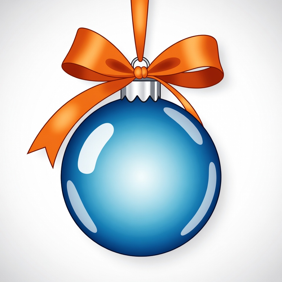 A blue ornament with a shiny surface hangs by an orange bow. The background is light and simple, highlighting the ornament clearly.