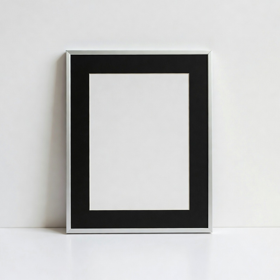 A blank frame sits against a white wall, showing only the outline of its black border. It is empty and ready for artwork.