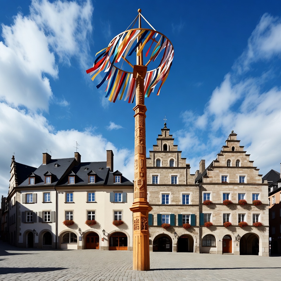 A wooden maypole stands in the town square surrounded by historic buildings under a blue sky. Bright ribbons hang from the top.