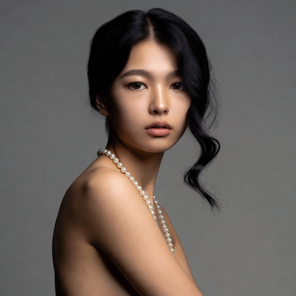 A woman poses with a string of pearls around her neck. The background is simple and the lighting highlights her features.