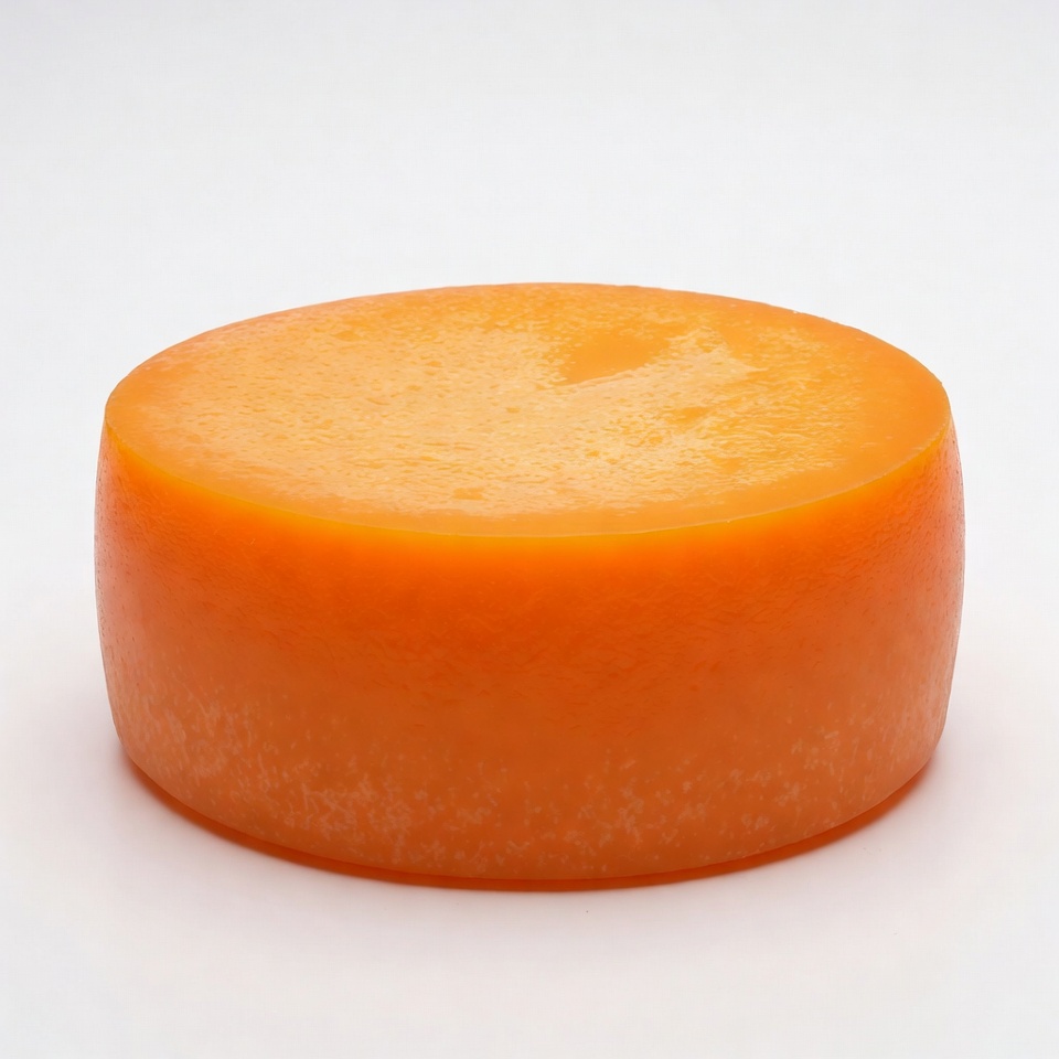 A round piece of orange cheese sits on a white surface. It is smooth and has no visible markings.