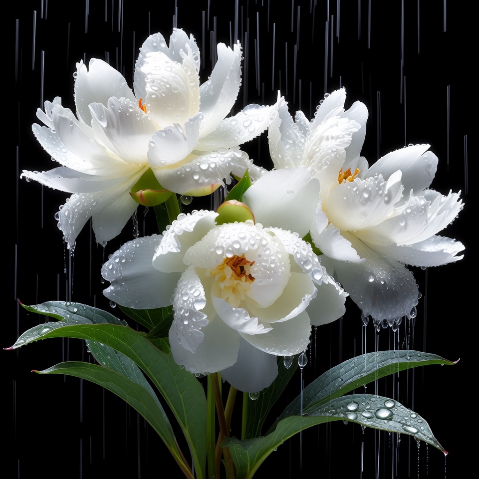 White flowers stand tall with water droplets on their petals. Rain cascades down, creating a beautiful scene in this moment.