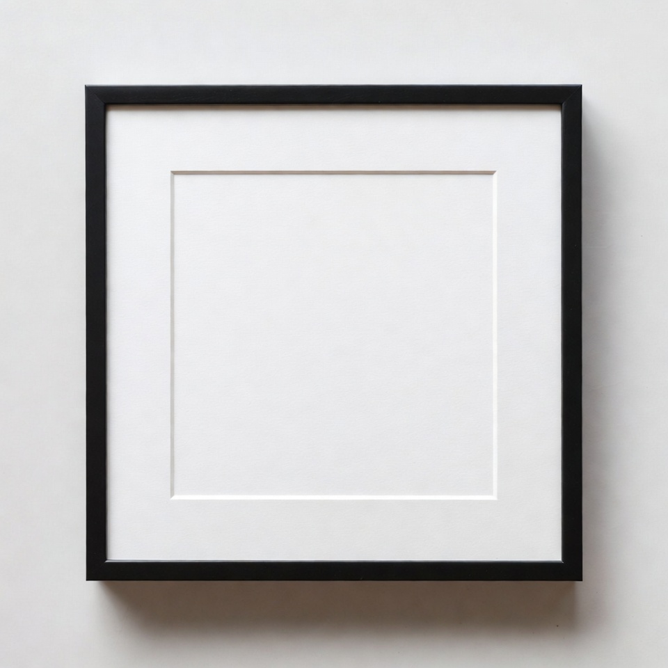 A black framed empty space hangs on a plain white wall. It is ready for a picture or artwork to fill the space.