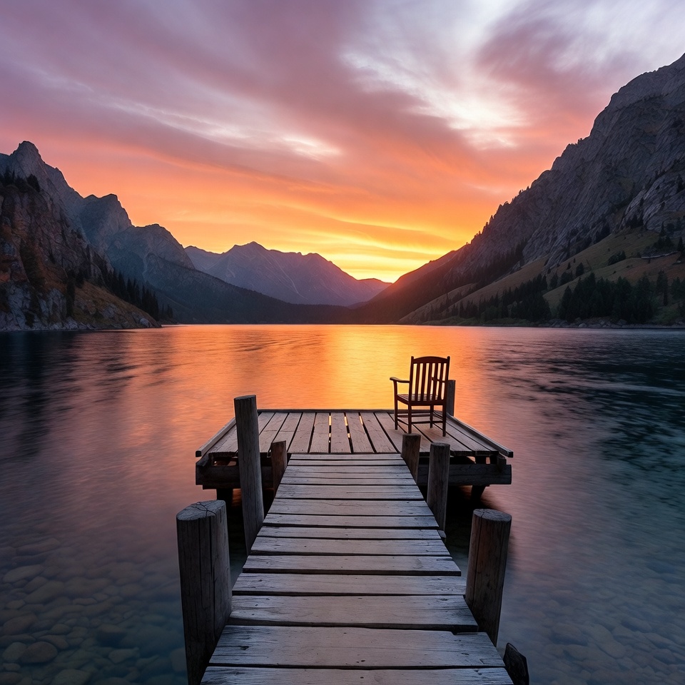 A dock extends into a lake, with a wooden chair placed at the end. Mountains surround the water, illuminated by a colorful sunset.