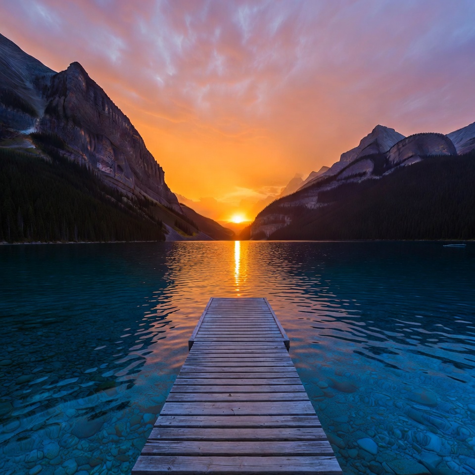 A dock extends over clear water as the sun sets behind mountains. The sky shows colors of orange and purple during the evening.