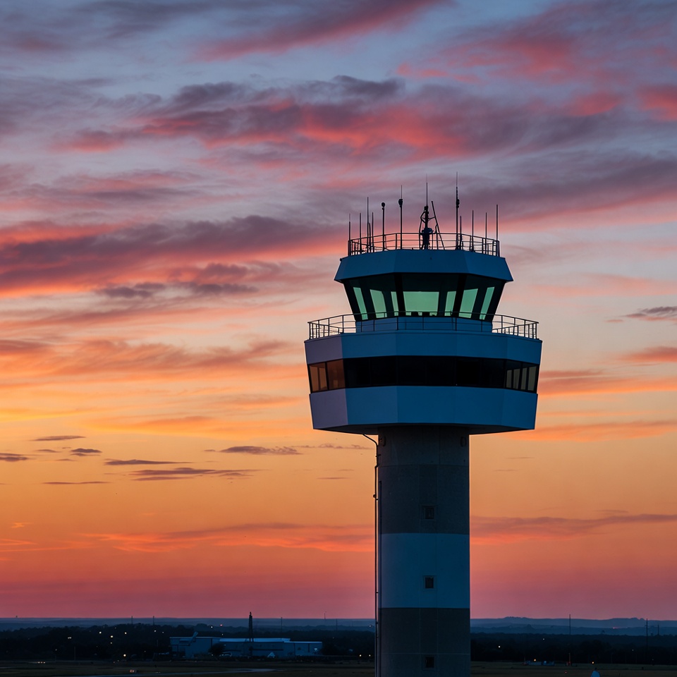 The control tower stands tall against a sunset sky at an airport. This scene shows the vibrant colors and silhouette of the tower.