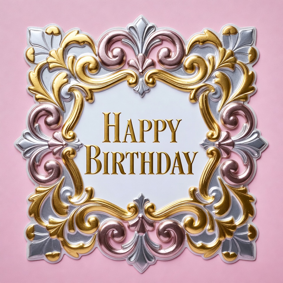 art, birthday, celebration, color, decor, design, elegant, festive, frame, gold, greeting, handmade, happy, message, party, pink, silver, style, text, wishes