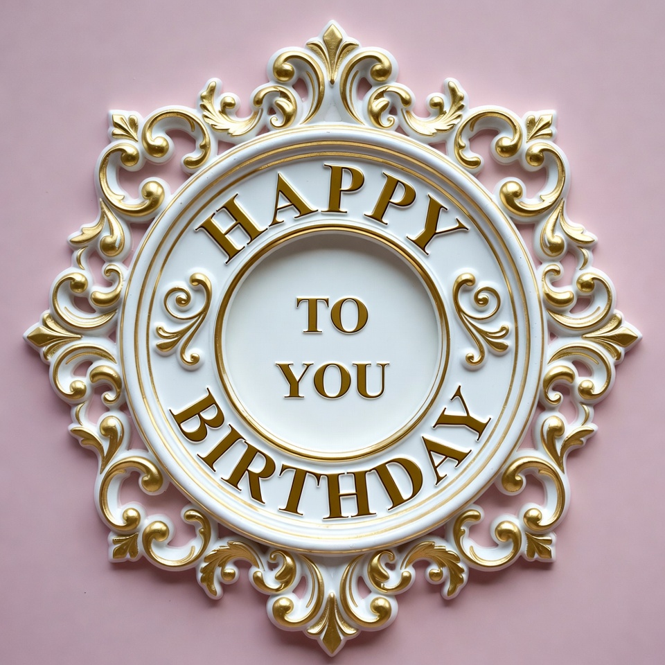 A birthday decoration is displayed on a pink wall. The sign features ornate design with letters saying happy birthday to you.