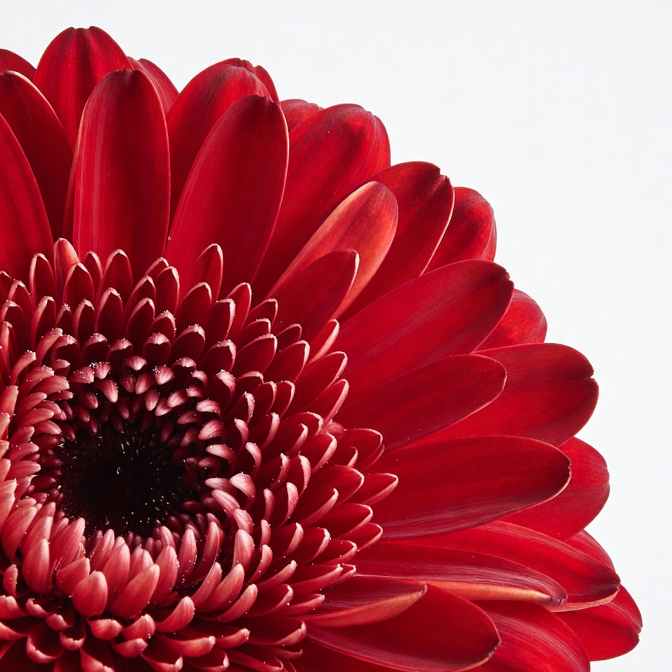 A close-up view of a red flower showcasing vibrant petals and a dark center against a plain white background.
