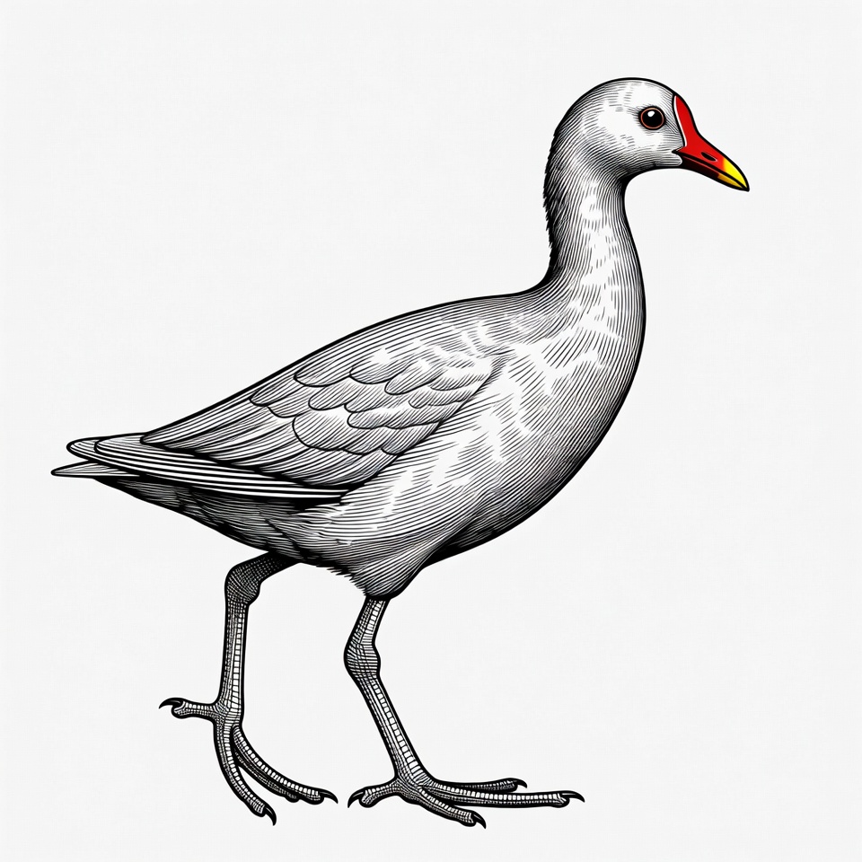 animal, art, avian, beak, bird, design, detail, fauna, feet, gray feathers, illustration, legs, lines, nature, plain background, red bill, side view, standing, walking, wildlife