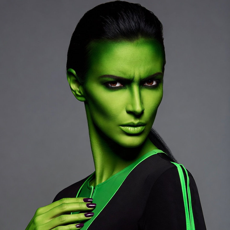 A model displays striking green body paint while striking a strong pose. The backdrop is grey, highlighting the vibrant color and expression.