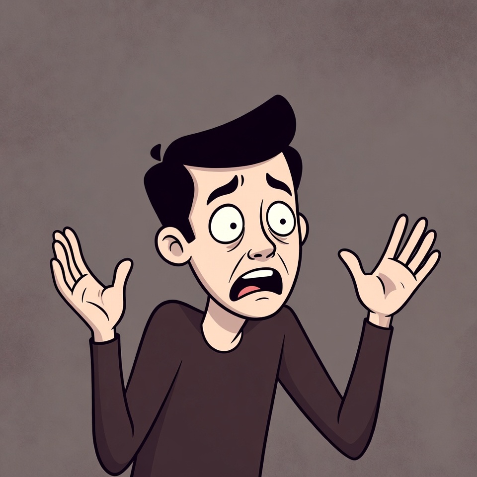 alert, animated, character, concerned, emotion, expression, face, fear, gesture, hands raised, man, neutral, plain background, reaction, scene, shock, simple, startled, surprise, worried