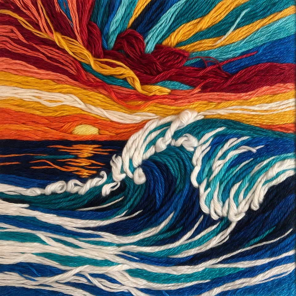 Waves and a sunset created with colorful threads. It captures movement in the ocean and bright colors in the sky.