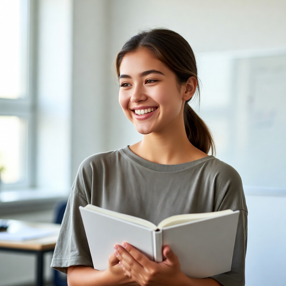 Young woman stands in a bright classroom, smiling and holding an open book. She seems engaged in her reading activity.